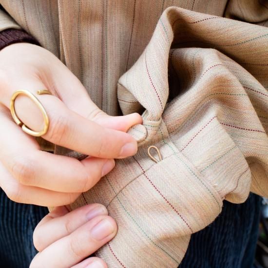 袖口にボタンもついているのでキュッと縛り袖に膨らみを持たした着こなしもオススメです。