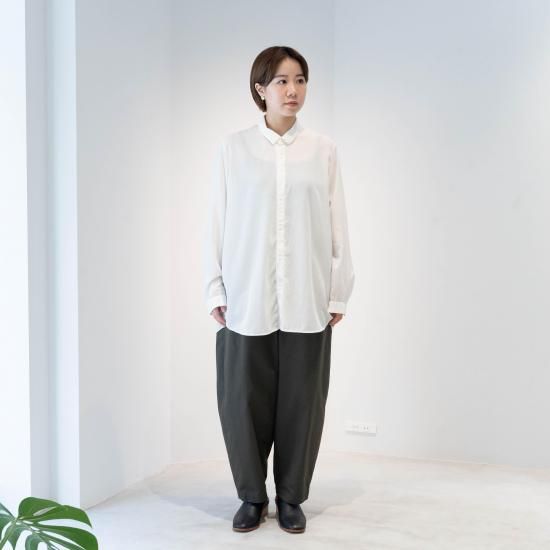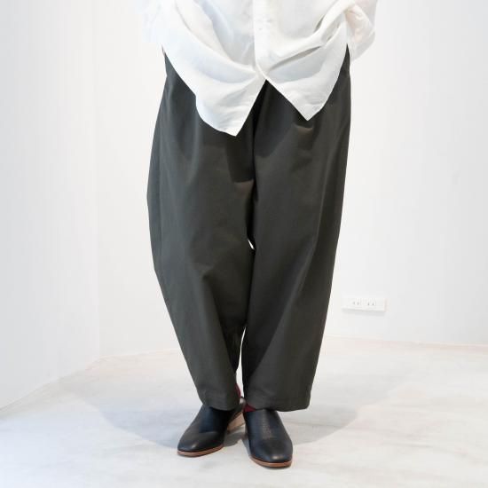 脇に丸みがあり、裾近くで強くテーパードしたフルレングスのパンツ。