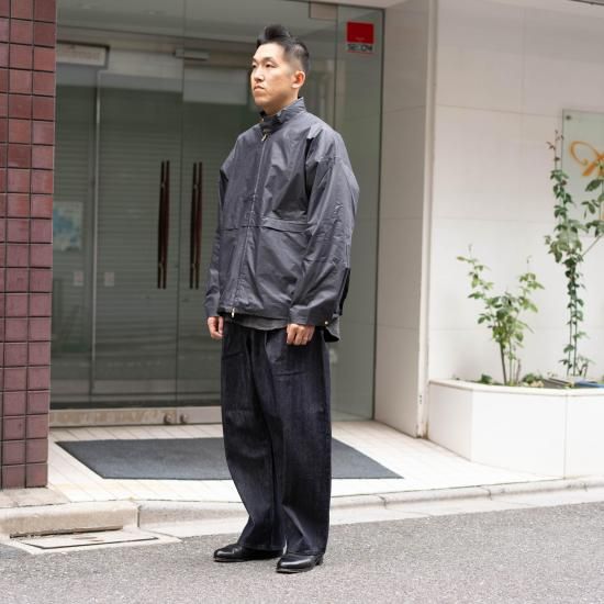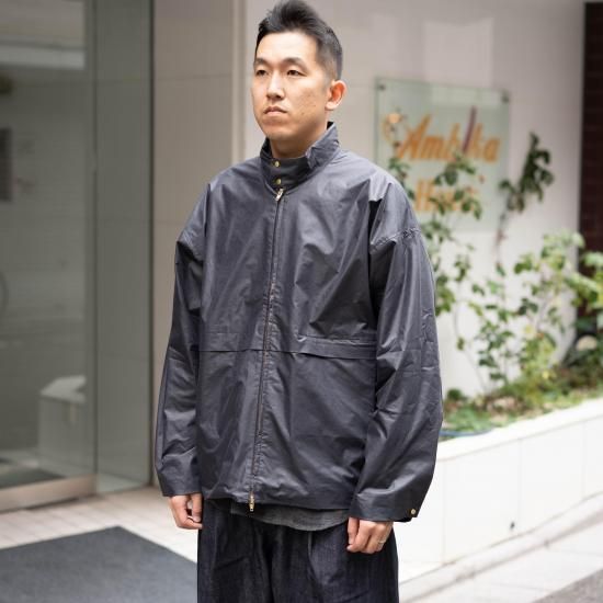 高密度に織り込んだツイルに撥水光沢加工をしたオイルドコットン地のようなブルゾンです。