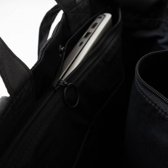 ノートパソコンをリュック以外で持ち運べる選択枠を増やしたいというデザイナーの思いから制作されたのがこちらのトートバッグ。
