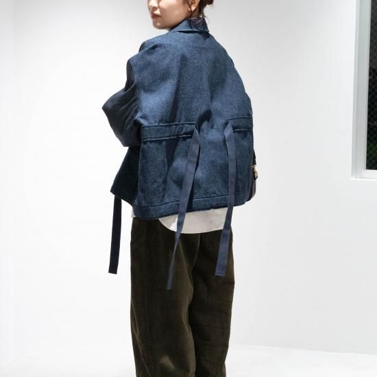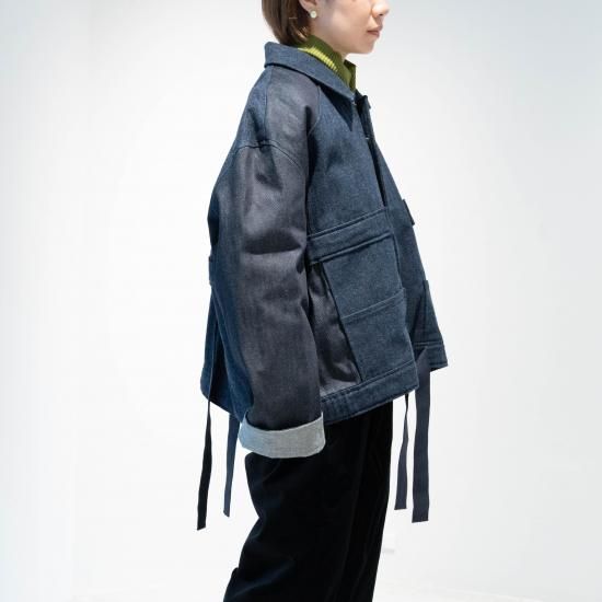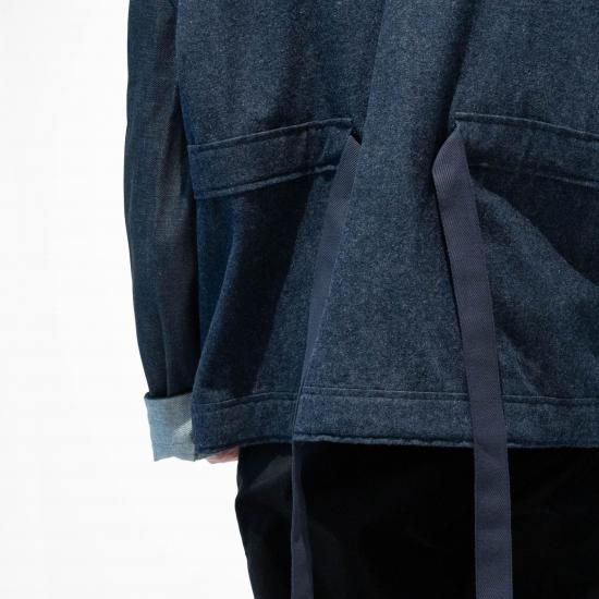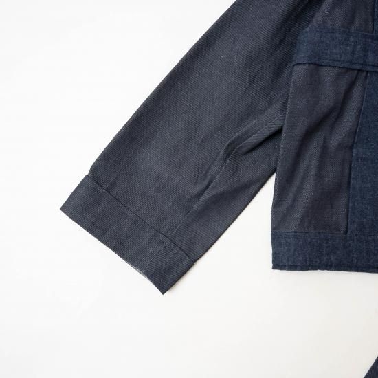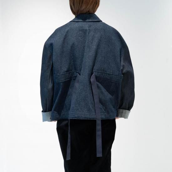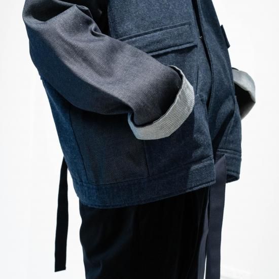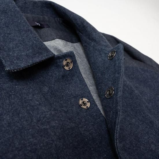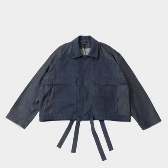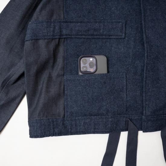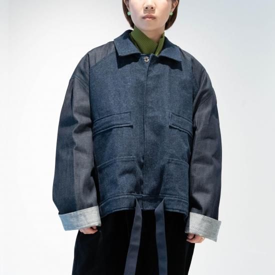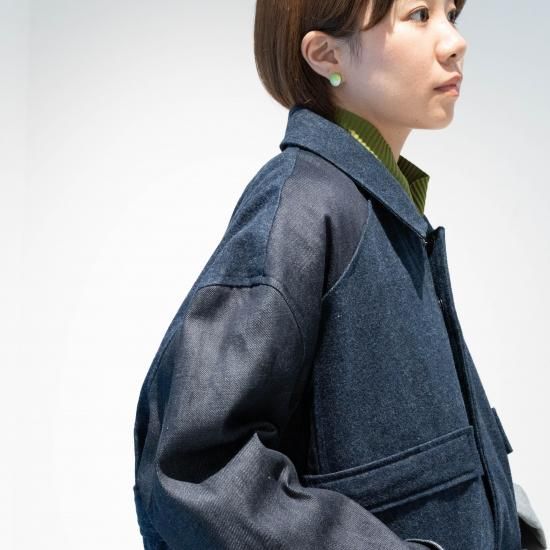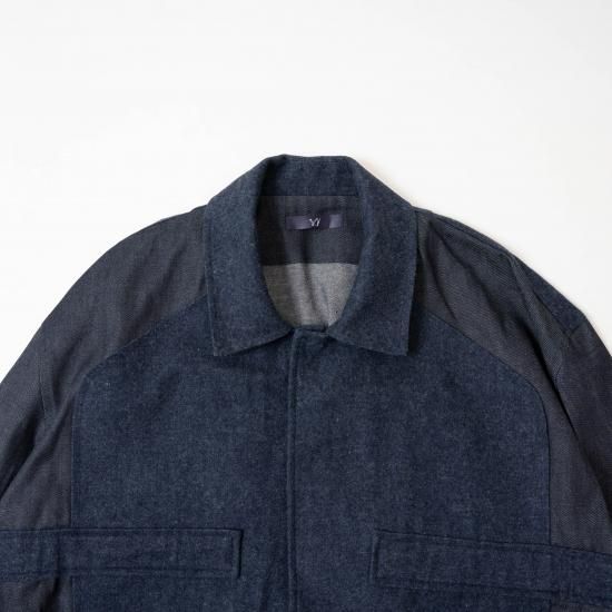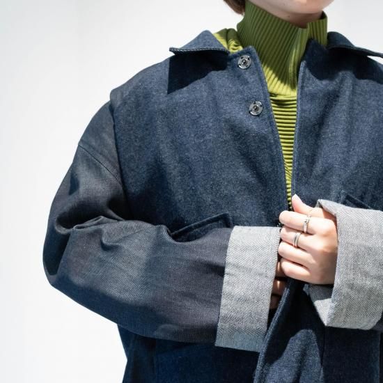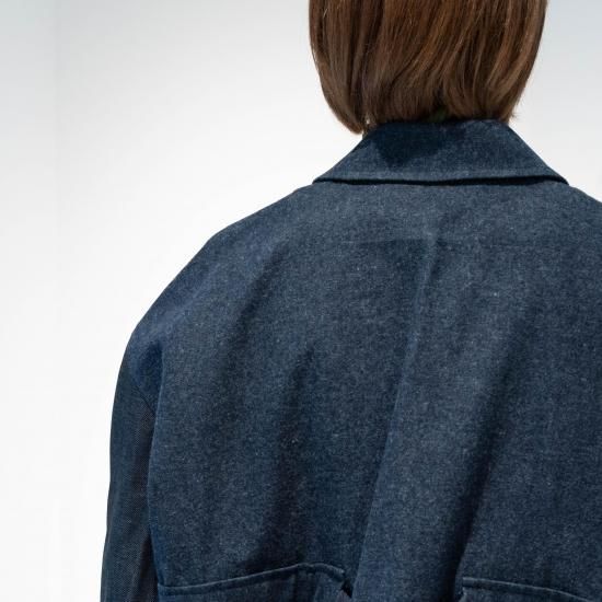 ゆったりとしたサイジングで、2種類の素材を切り替える曲線が特徴的なジャケット。