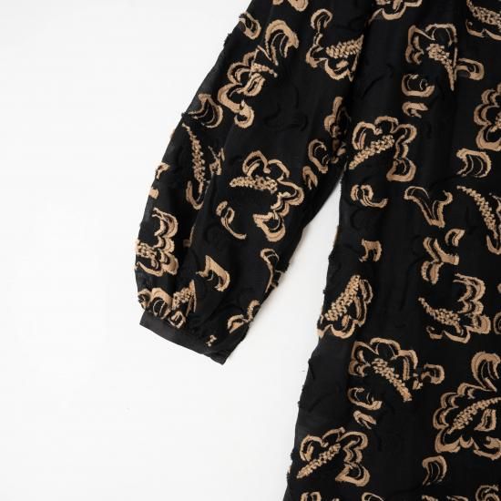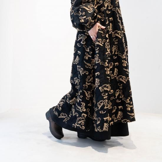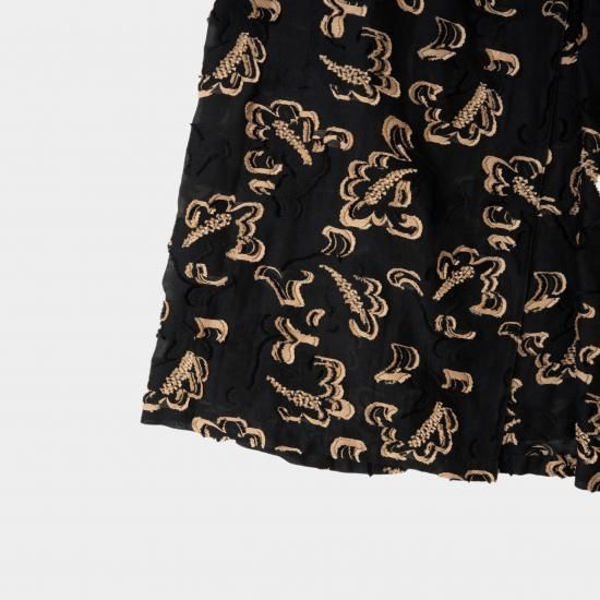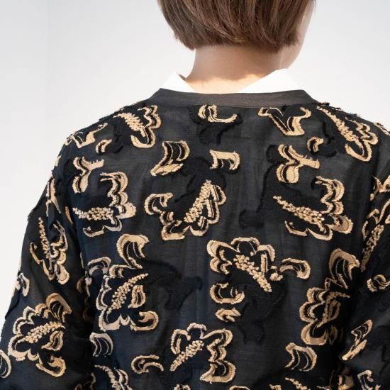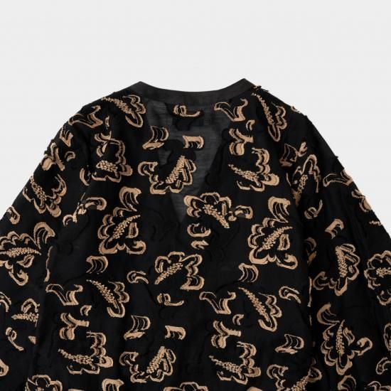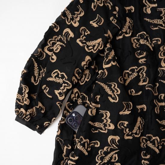 生地には、古いドローイングを元に制作した2024SS のペイズリー柄をテーマの映画に出てくる⼈物が着⽤する、レオパード柄からイメージして⼤胆にカラーリングを変更したコットンナイロンのオリジナル⽣地を使用。