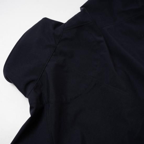 生地の適度なハリが、立ち上がる襟やダイナミックなシルエットを際立たせ、モダンで洗練されたムードを演出。