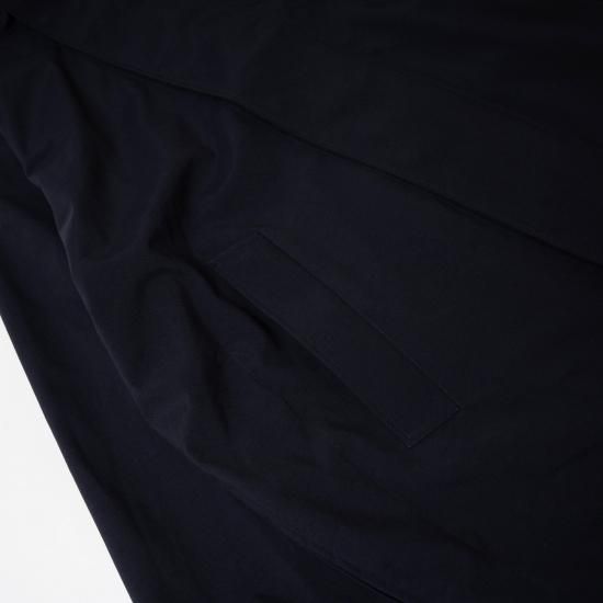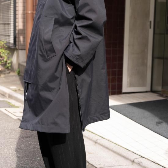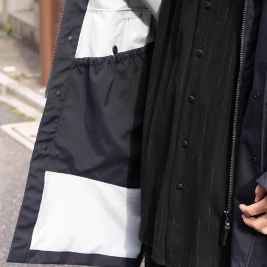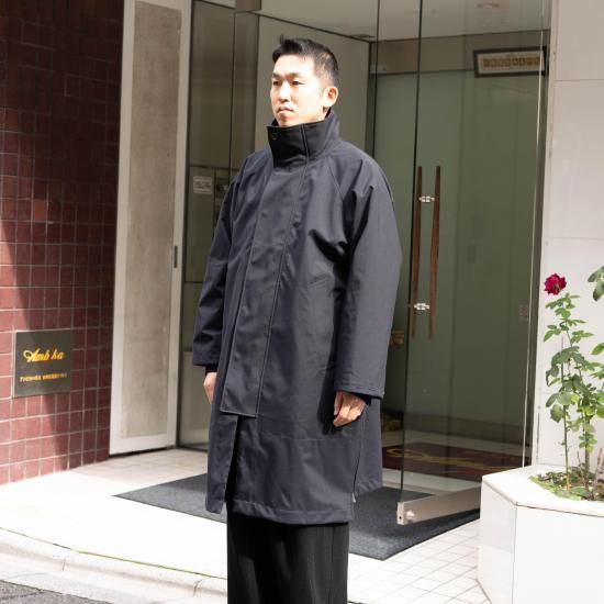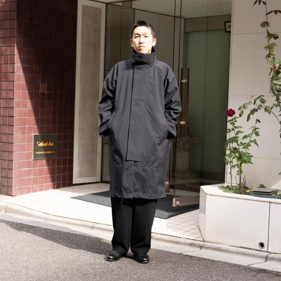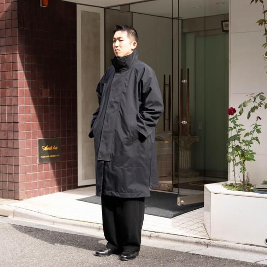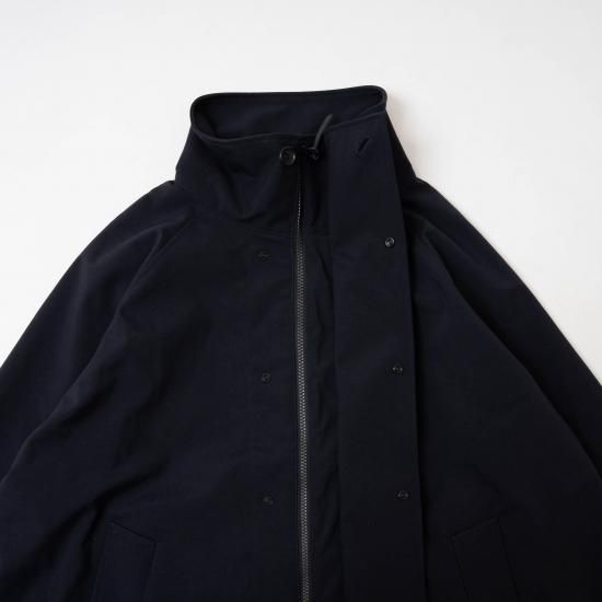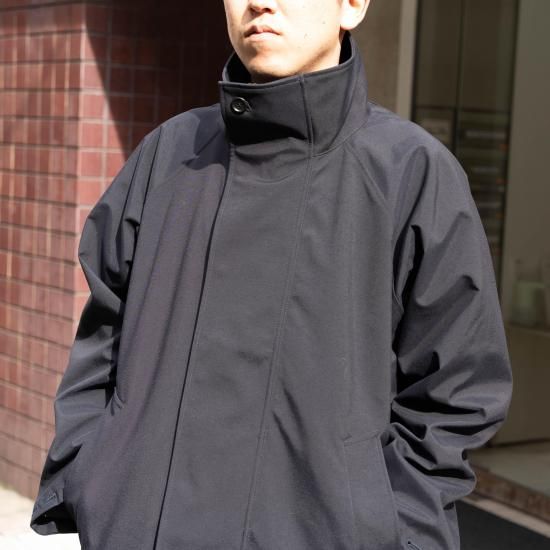 天然素材のような質感を持つタスランナイロンオックスを使用した、3レイヤーのスタンドカラーコートです。