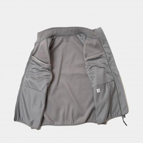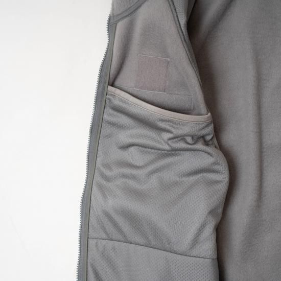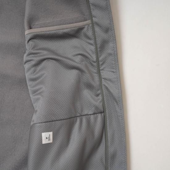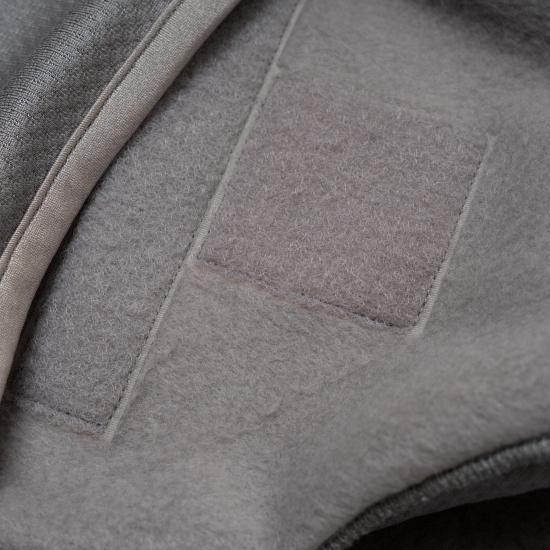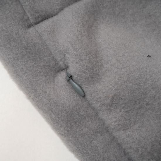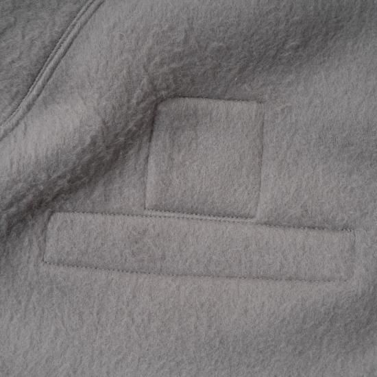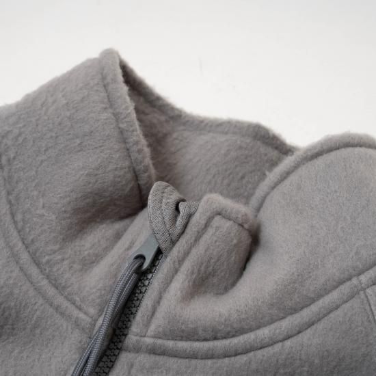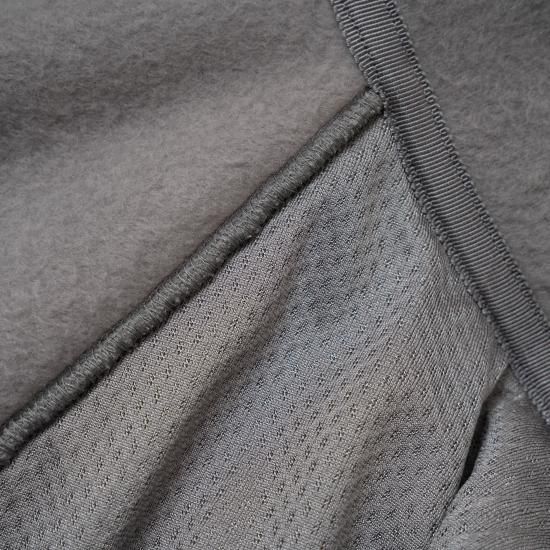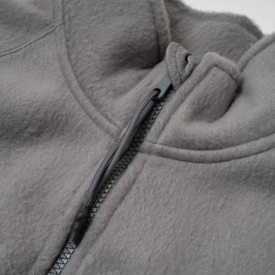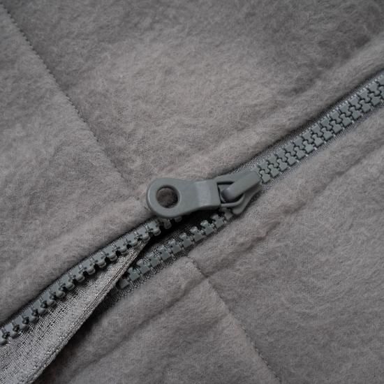 なめらかな肌触りのポリエステル糸と中空構造糸(糸の中に大きな空洞を作り、繊維そのものの中に空気を封じ込める)をブレンドし、軽く温かいフリース生地です。