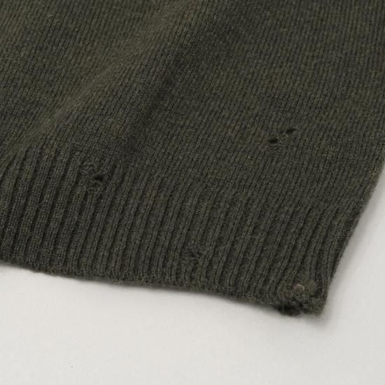 ダメージ加工ではなく編みの段階で糸を飛ばすテクニックを使いダメージ感を表現しています。
