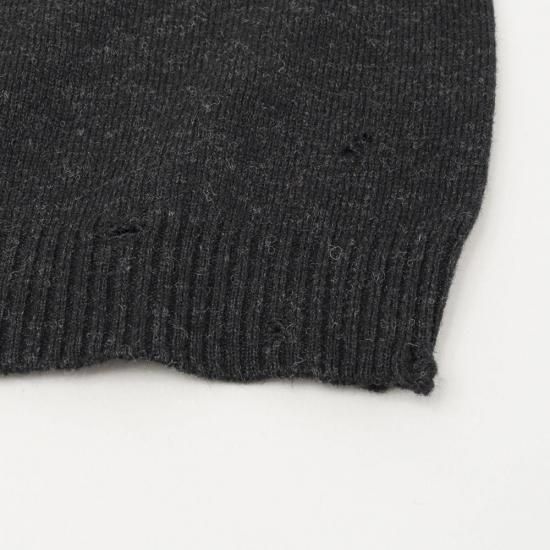 ダメージ加工ではなく編みの段階で糸を飛ばすテクニックを使いダメージ感を表現しています。