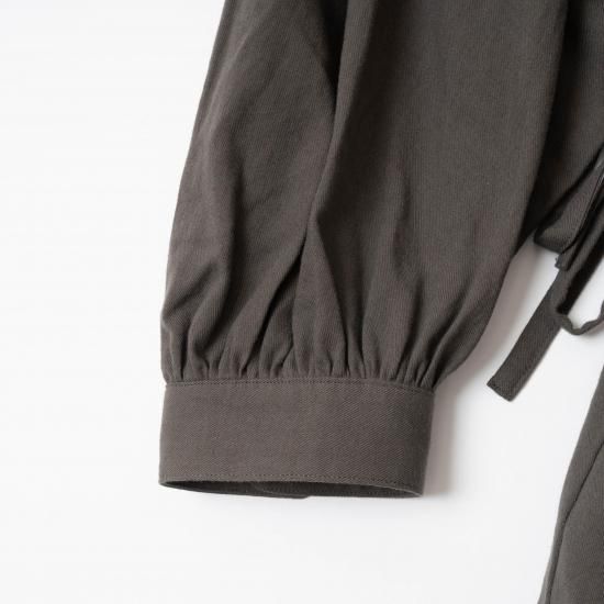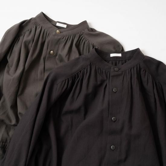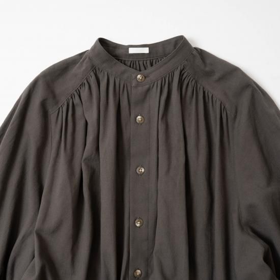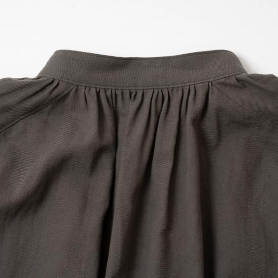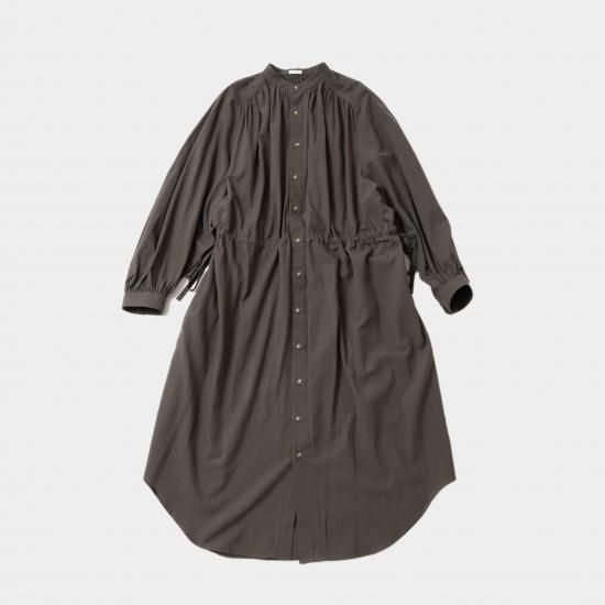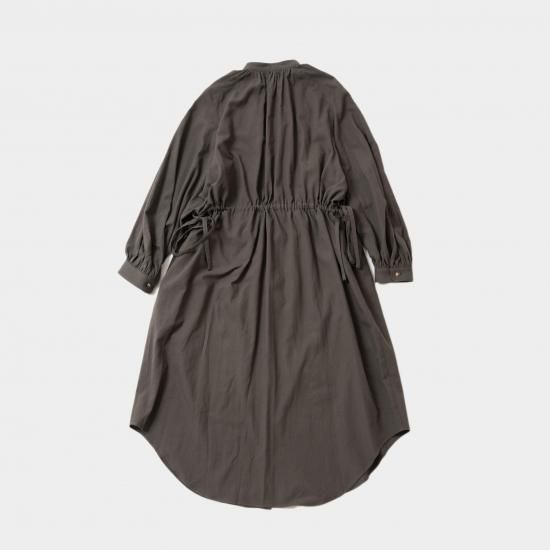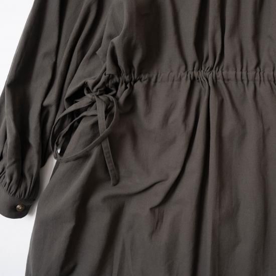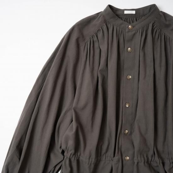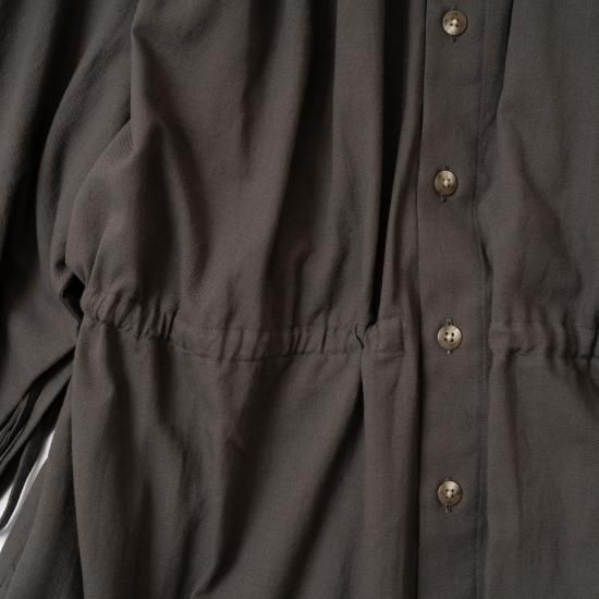 襟元、背中、袖口、ウエストにたっぷりとギャザーを寄せたシャツドレスです。