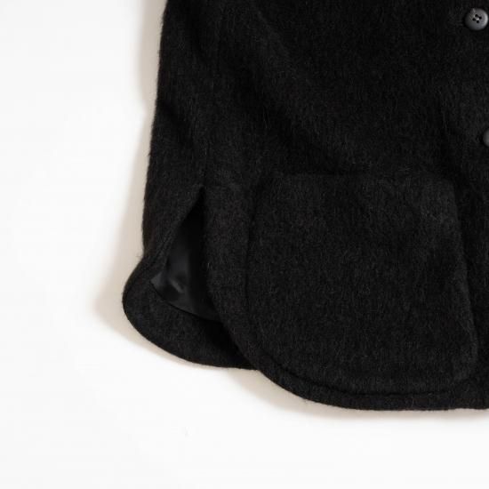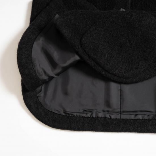生地には、2⾊の異なるトップの⿊いアルパカ⽷を主体に、
