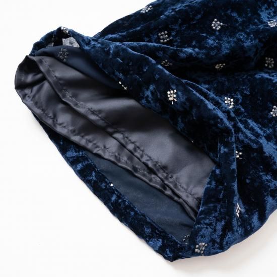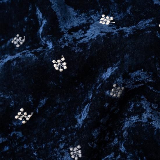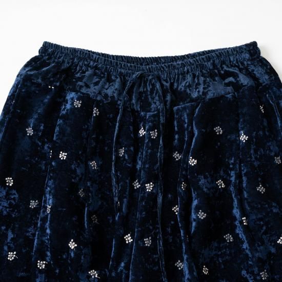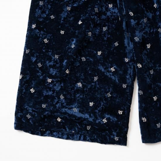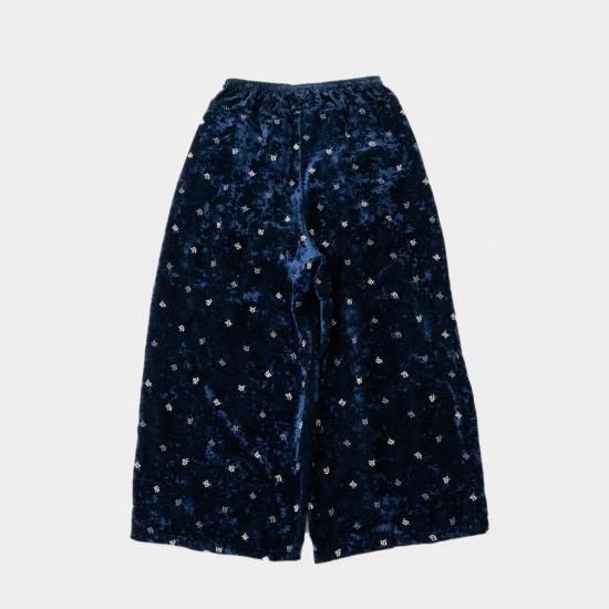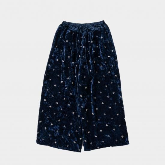 光沢の綺麗なベルベットに刺繍を施した、ワイドシルエットのタックパンツです。