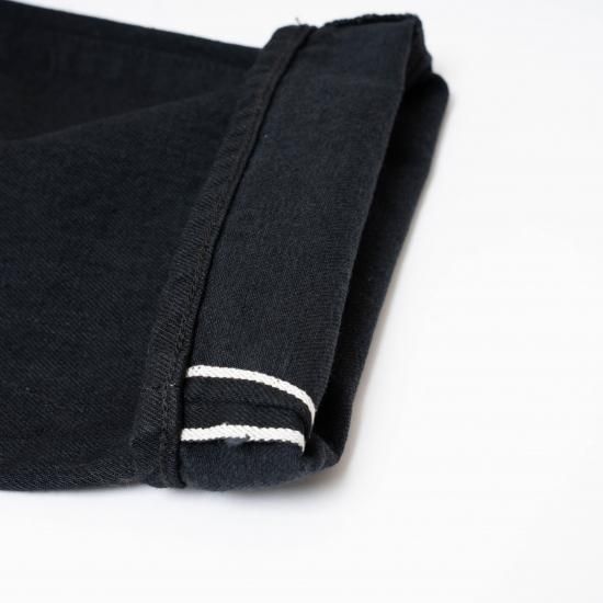 広島県福山市にある工場の特殊染色技術により、色落ちした際に濃淡が0/100で現れず、非常に奥行きのある黒になるようロープ染色にて織りあげています。