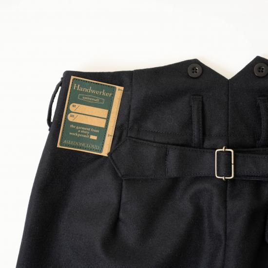 Handwerker(ハンドベーカー)とはドイツ語で“職人”。空想の職業から生まれ出る特別な生活着やワークウエアを作り続けるASEEDONCLOUDから派生した小さなコレクションです。毎シーズン新しいコレクションを作り出す中で、ある種の普遍性を有したウエアだけを抜き出し、“職人の服”というカテゴリーで展開。使用される生地もこだわりぬかれた素材を使用し、日々の仕事や生活で活用できるさまざまなディティールも特徴です。特に明治から続く岡山の帆布工場で、1970年代のベルギー製織機により無糊でゆっくり織られた生地や、シャットル織機での雲斎織を特別な色で染めたシリーズはプロユースにも耐えうるもので、未来のヴィンテージになりうるウエアです。